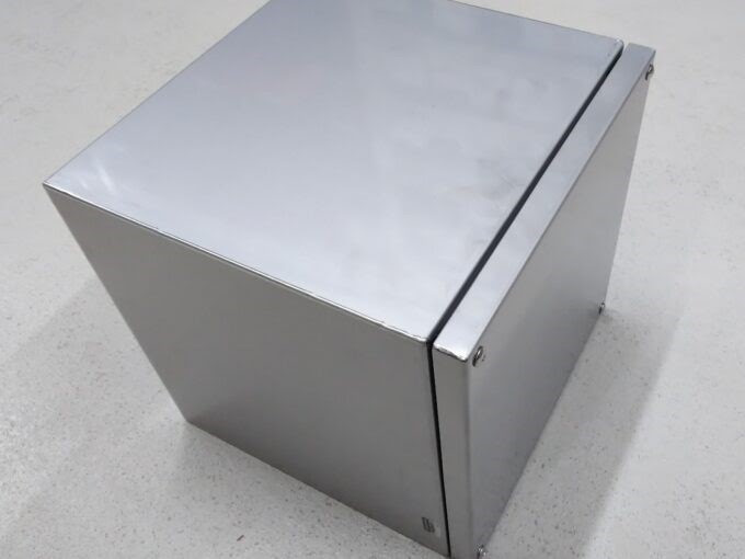 国交省仕様のSUSプルボックスです。屋外仕様のプルボックスで、水切り防水蓋で製作しております。内部は絶縁ワニス仕上げで、アース端子付きです。