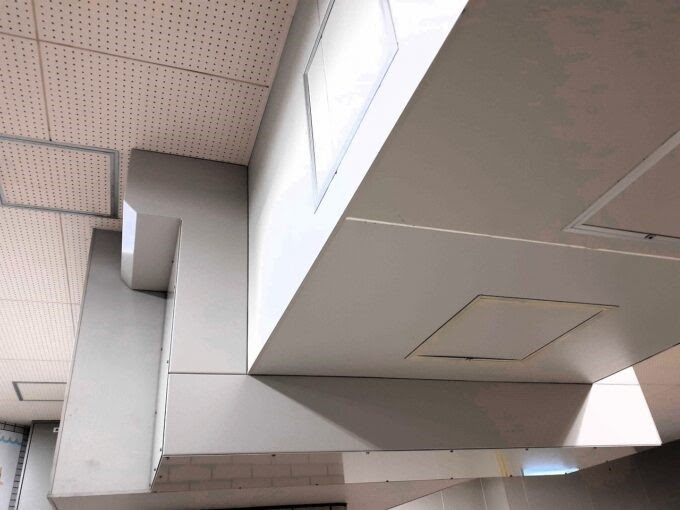 現場の設置箇所と同じ色をご希望でしたので、マンセル値5Y8/1と2.5Y9/1と2組を指定色塗装で製作いたしました。幅が2,400mm程度あったため、3分割で製作しボルトで組み立てる方法を取りました。左右で天井高さに違いがあり、長さも箇所によって違いがあったため、事前に現地で実測を行いました。