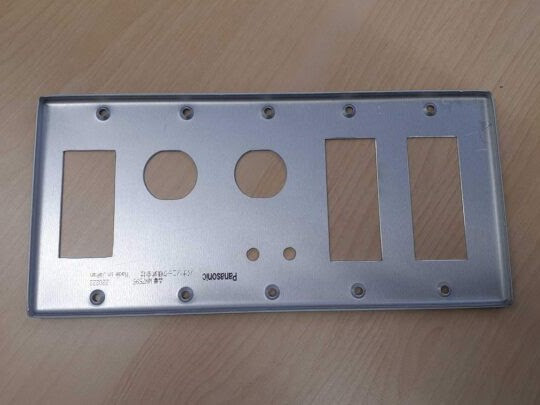 既製品の新金属カバープレート(WN7595)に、レーザーで穴開けを行いました。新金属プレートへの加工は難易度が高く、傷ができることがありますが、レーザーにより精密かつ美観性良く仕上げることができます。